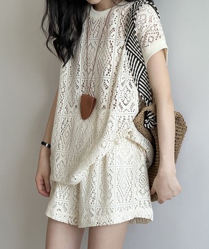 ♪tiktokライブ商品【セットアップ】デザイン性の高い ゆったりレースカットアウトコーデ クルーネック Tシャツ+ハイウエストショートパンツセット