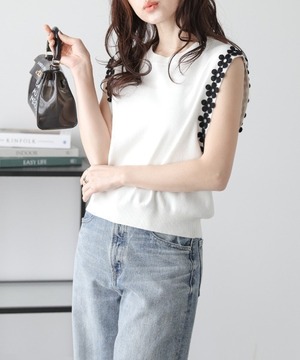 【トップス】フラワーモチーフ付きノースリーブニットトップス