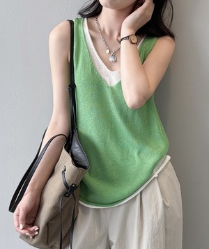 ♪tiktokライブ商品【トップス】上品なカラーブロックフェイクツーウェイ vネックキャミトップス ゆったり着痩せデザイン
