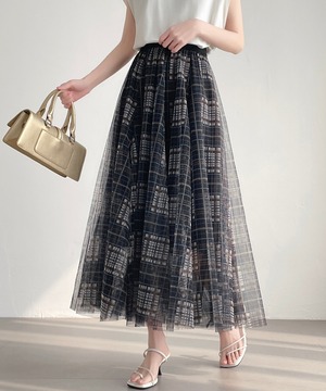 12.【スカート】韓国風 着回し力◎ 体型カバー チェック切り替え ボリュームたっぷり チュールスカート