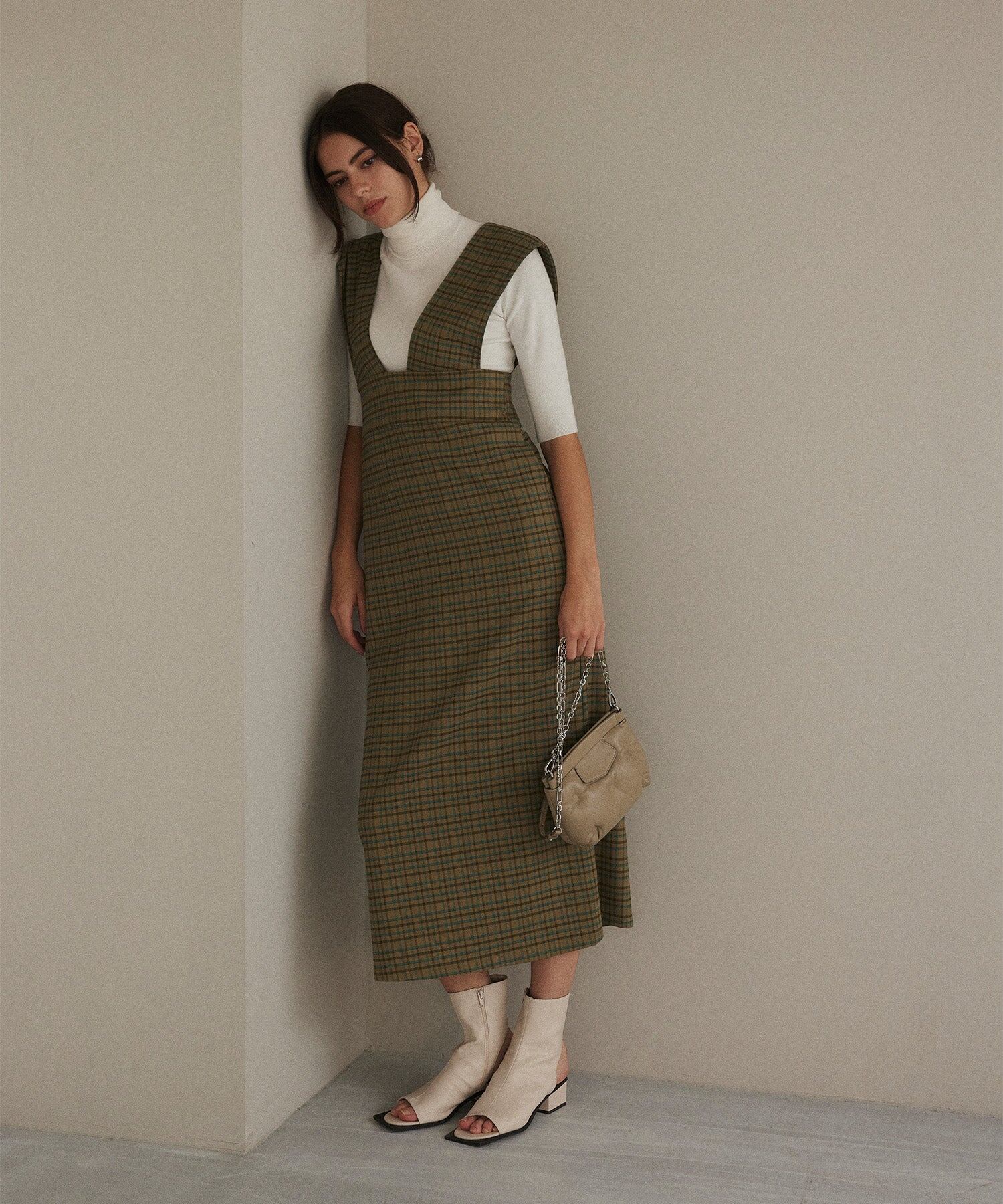 深めのVネックでレイヤードスタイルを楽しめるジャンパースカート。