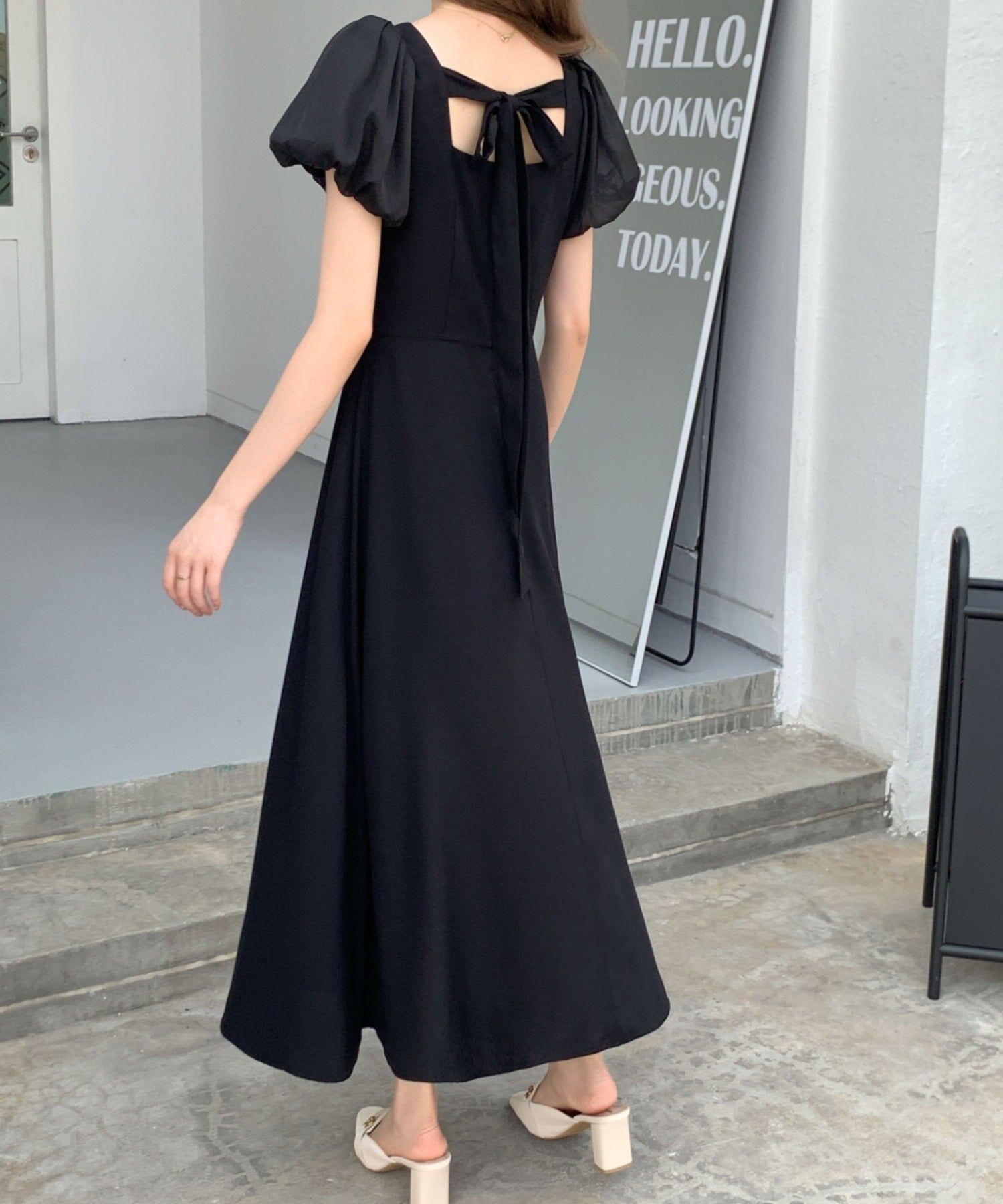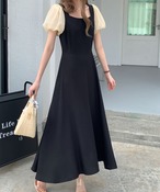 バックリボンパフスリーブフレアワンピース