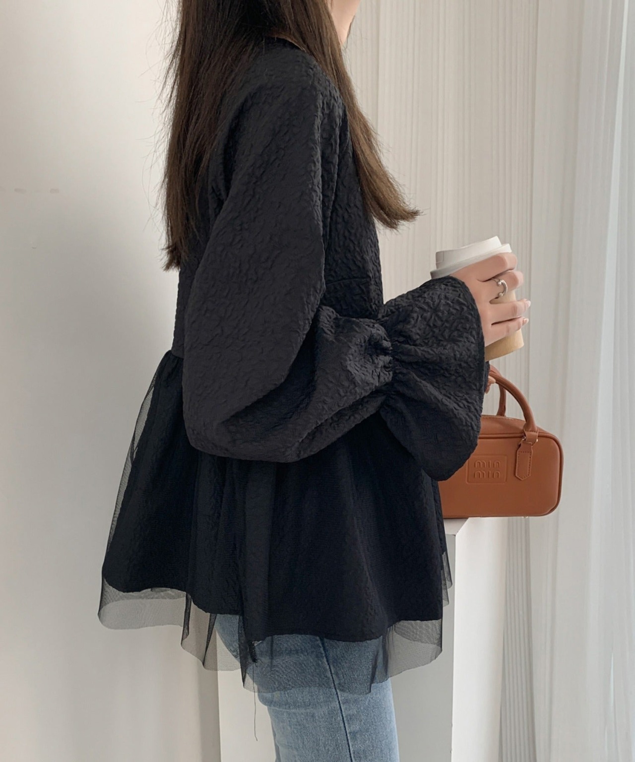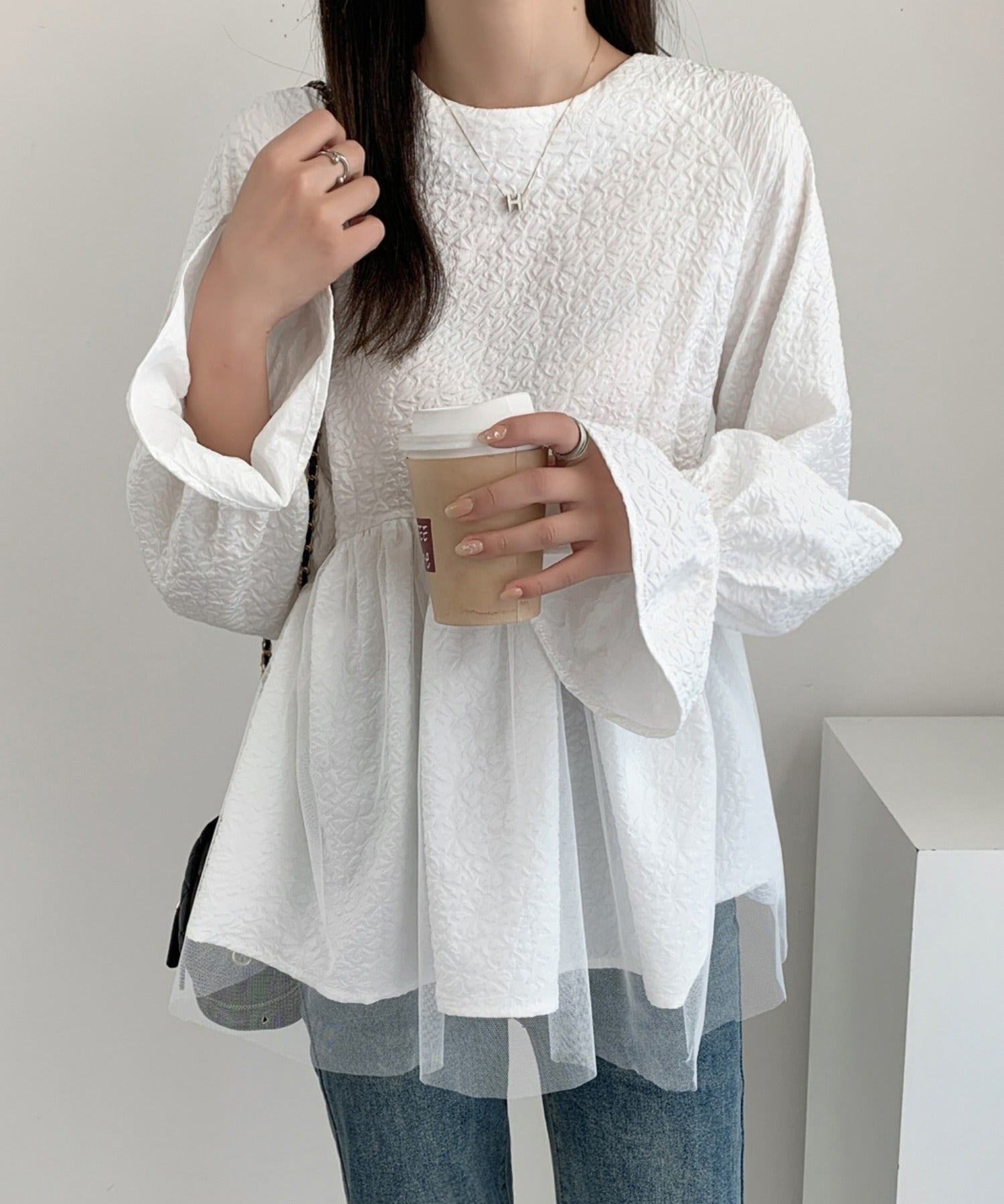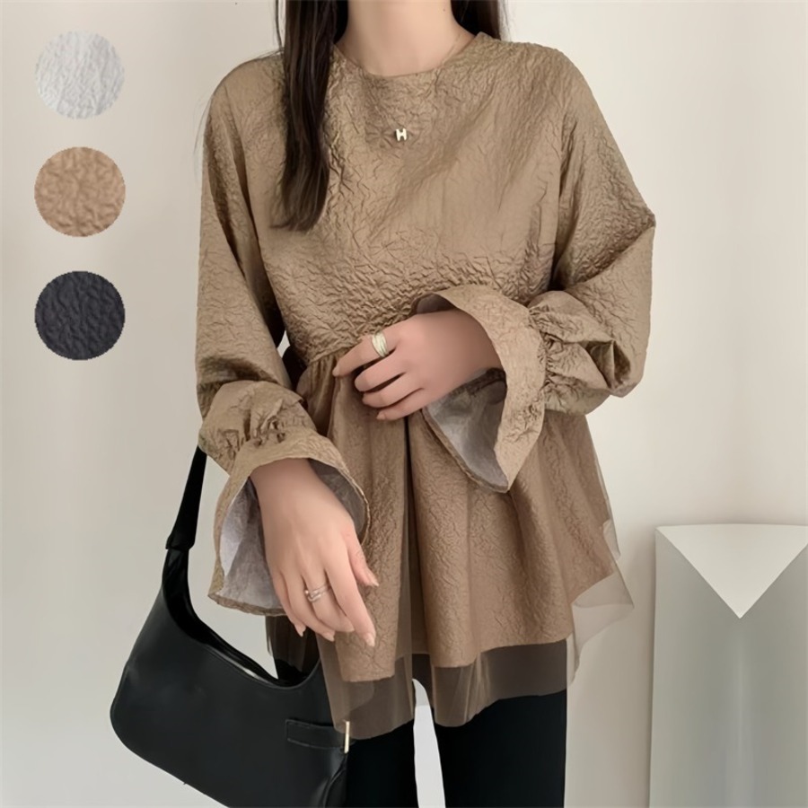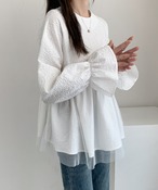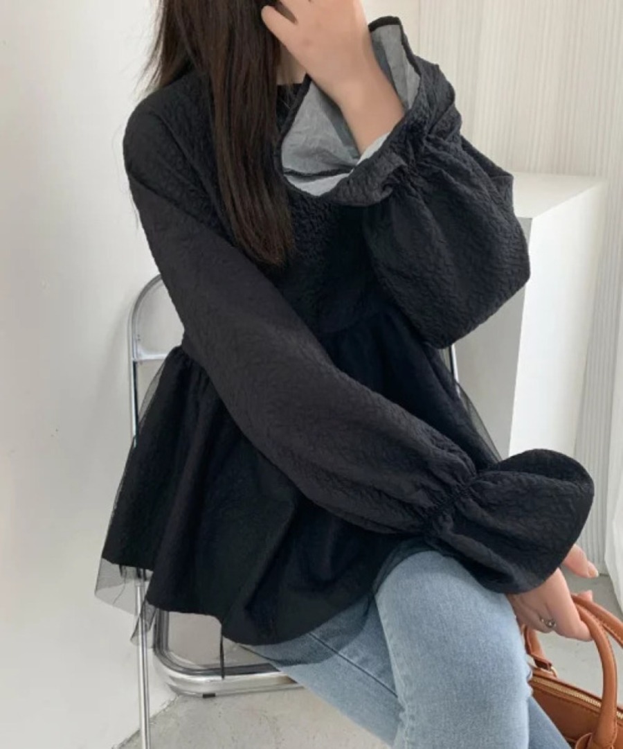 47.【トップス】メッシュ切り替え 長袖 エンボス加工 重ね着風 シフォンブラウス 3色