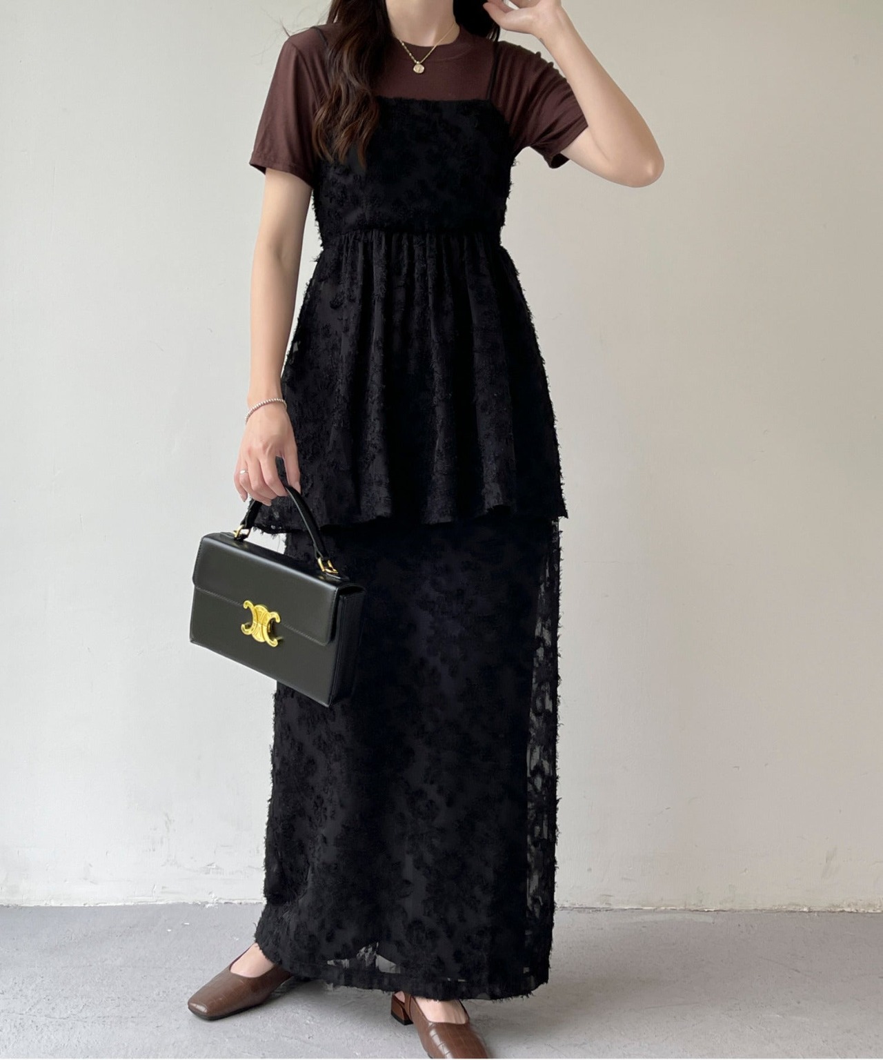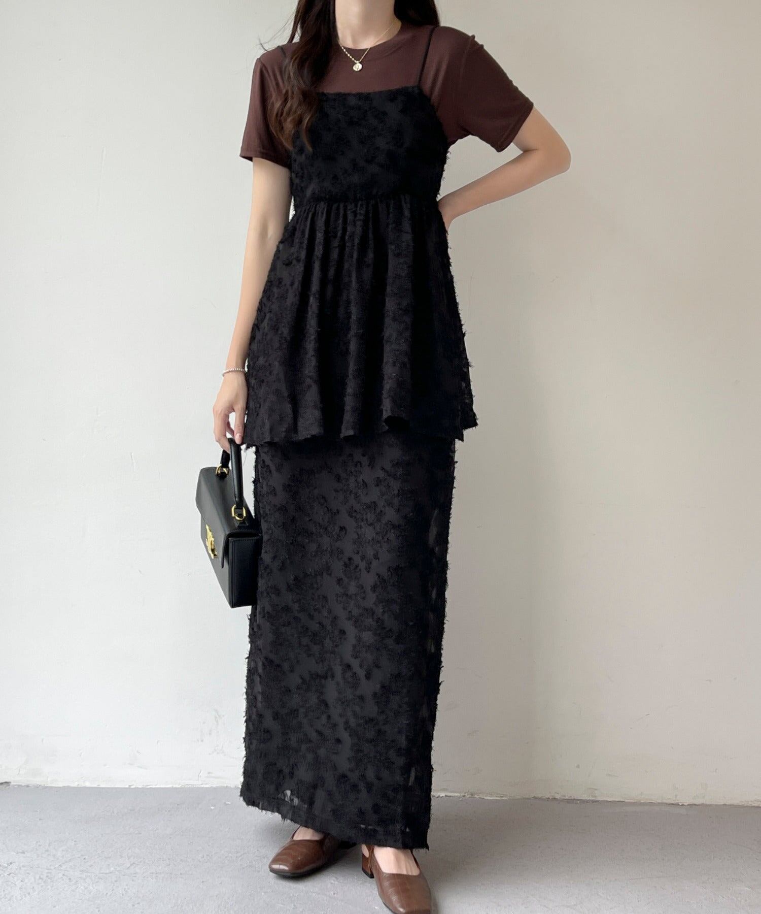 ジャガードぺプラムキャミ+スカートセットアップ