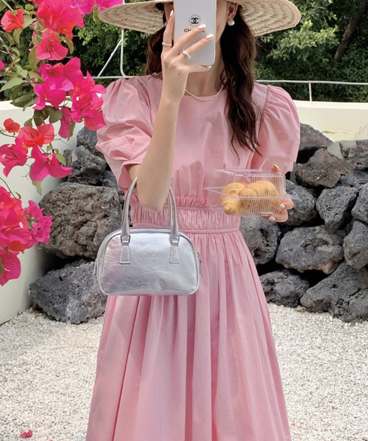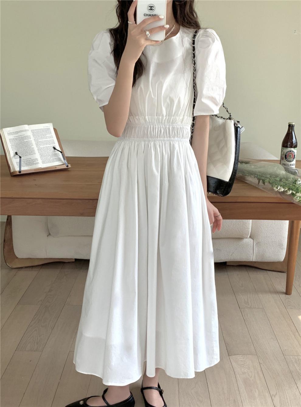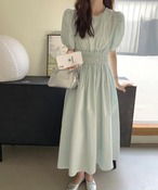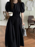 18.【ワンピース】スクエアネック パフスリーブ ウエストマーク 無地 森ガール風 ミモレ丈ワンピース