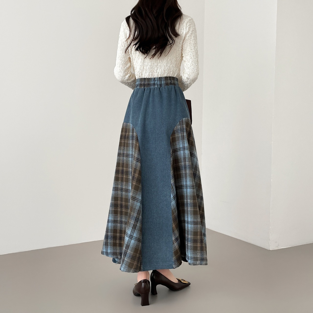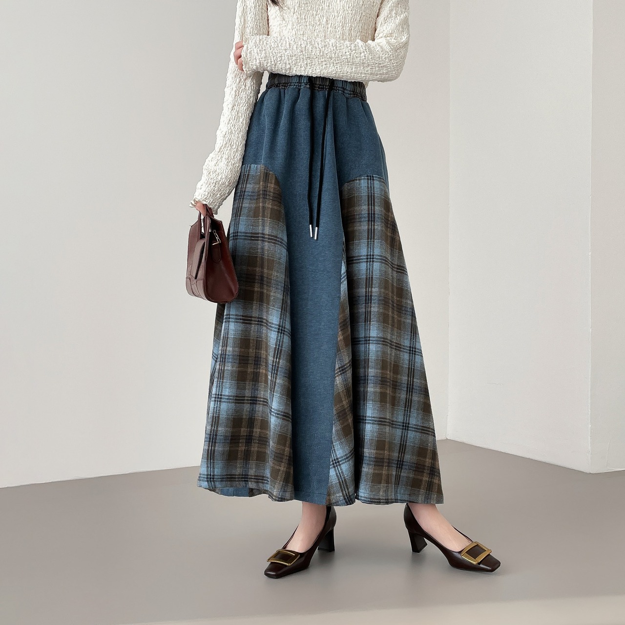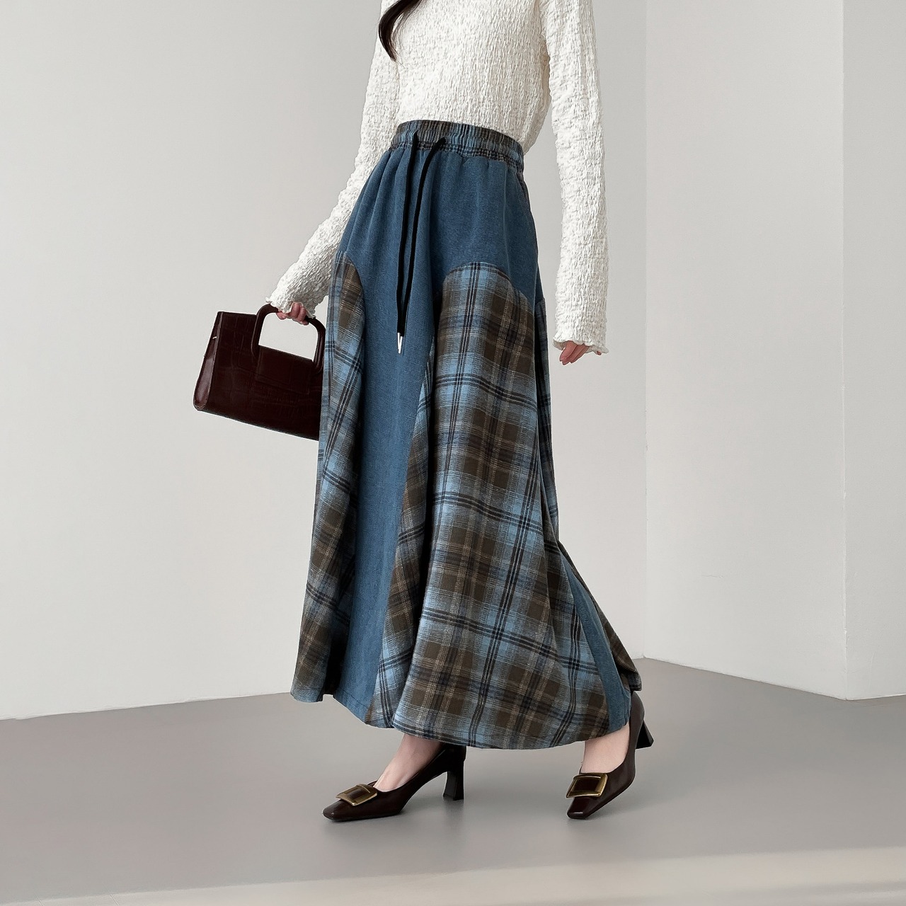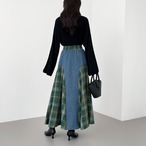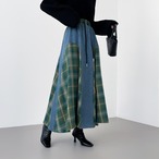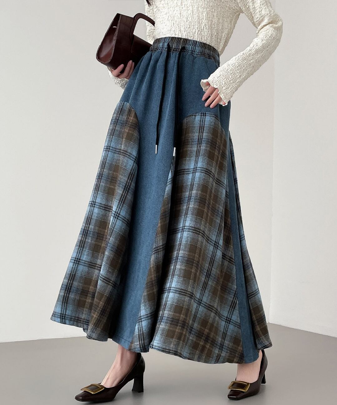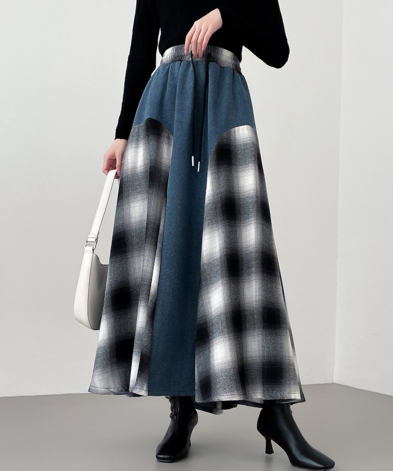 14.【スカート】起毛素材 チェック切り替え ウエストゴム&ドローストリング付き デニムAラインスカート
