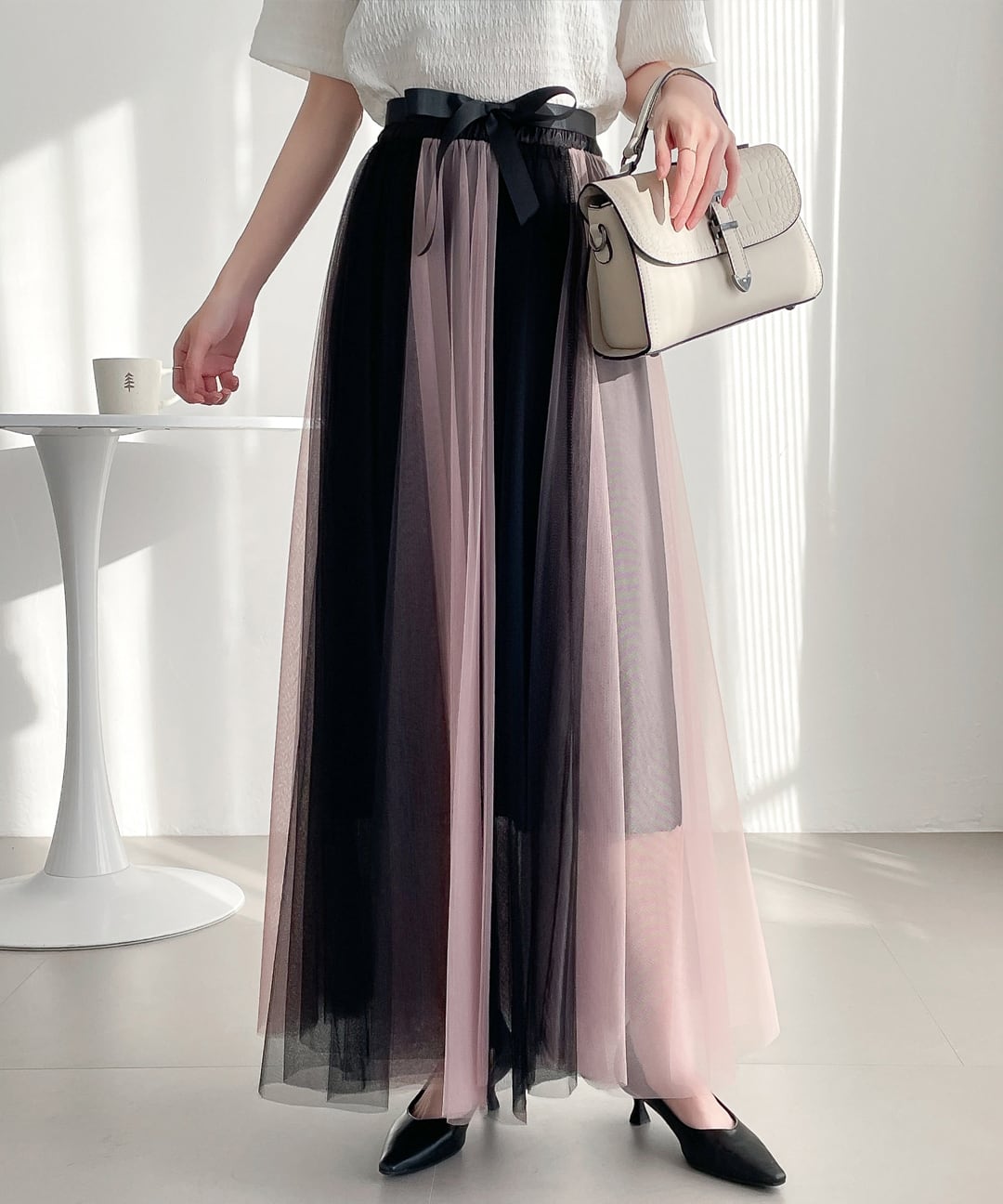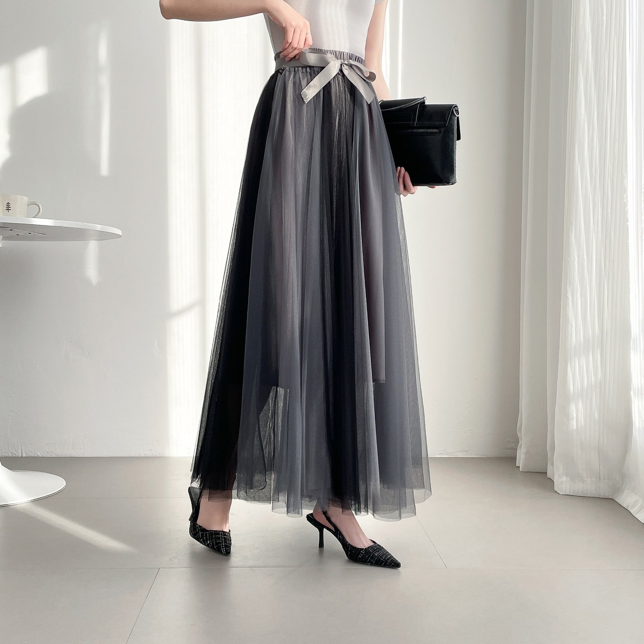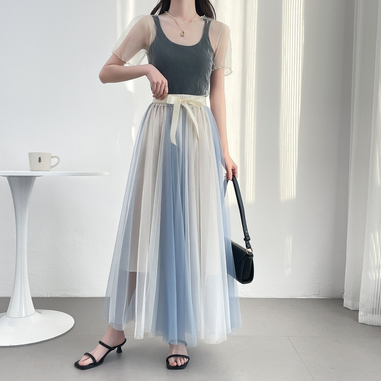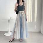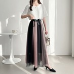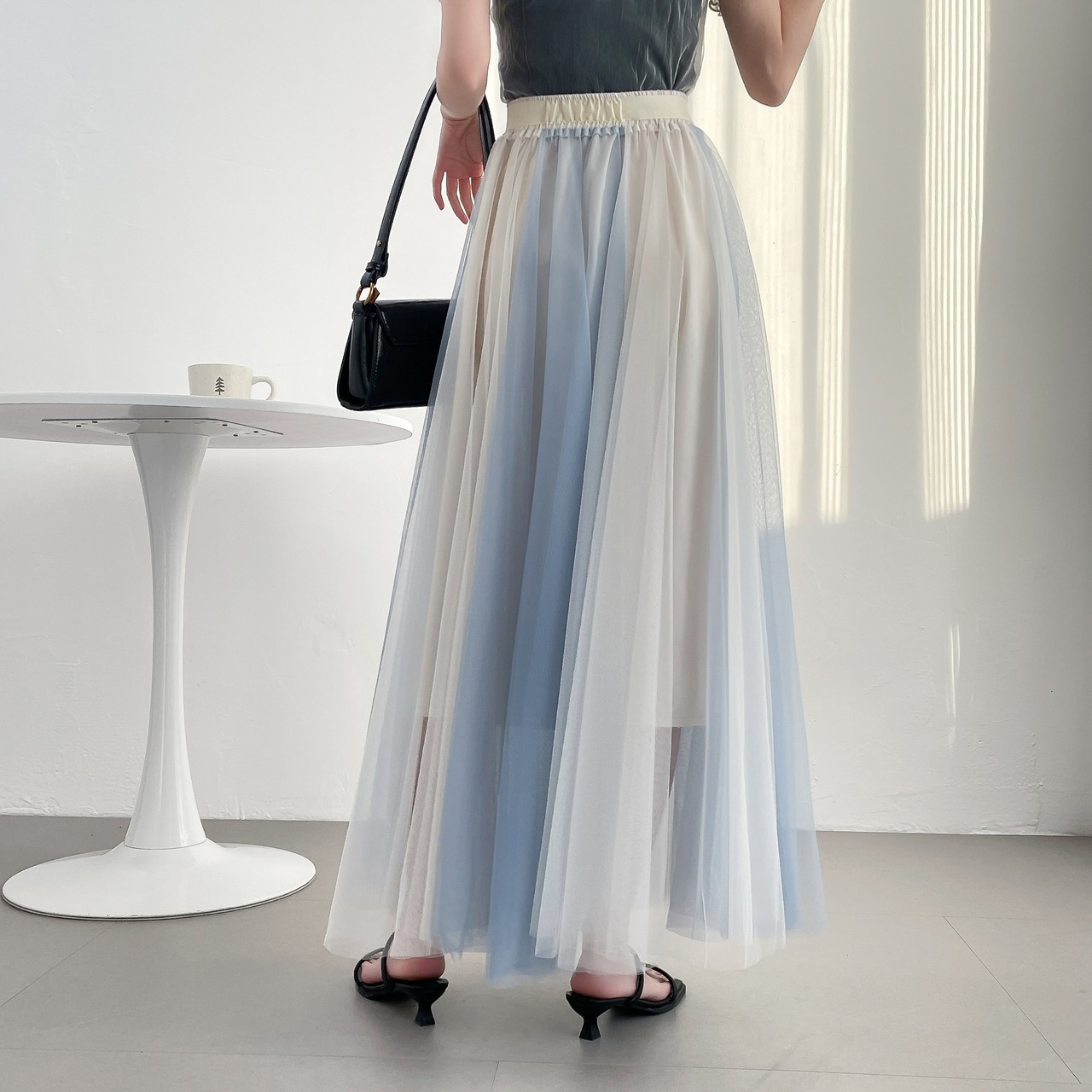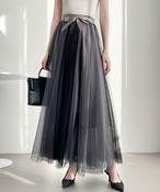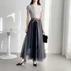 15.【スカート】ハイウエスト Aラインフレア カラーブロックメッシュ 中丈 ショートスカート