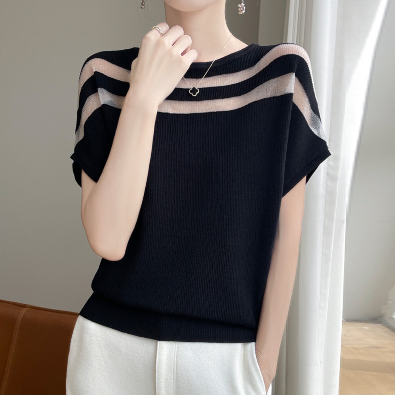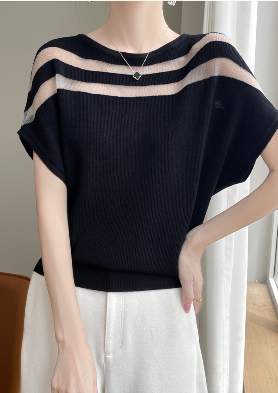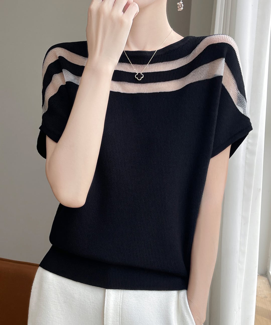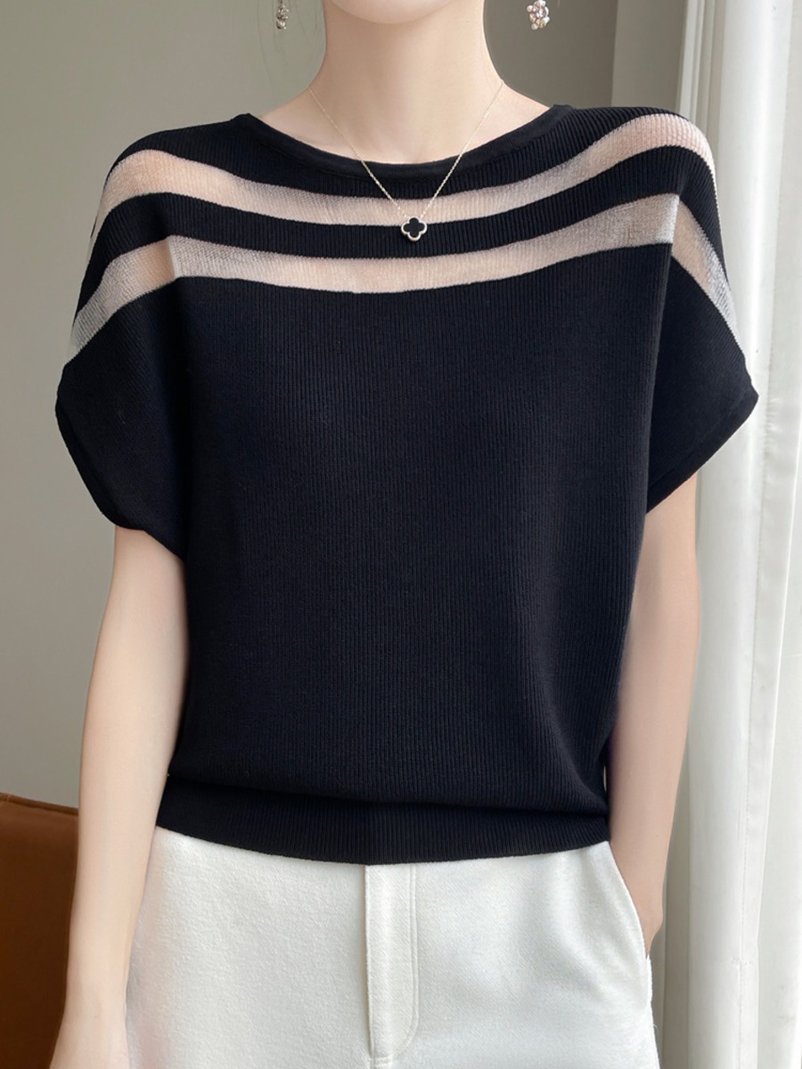 2.【トップス】シアー切替 半袖 ラウンドネック ニット トップス