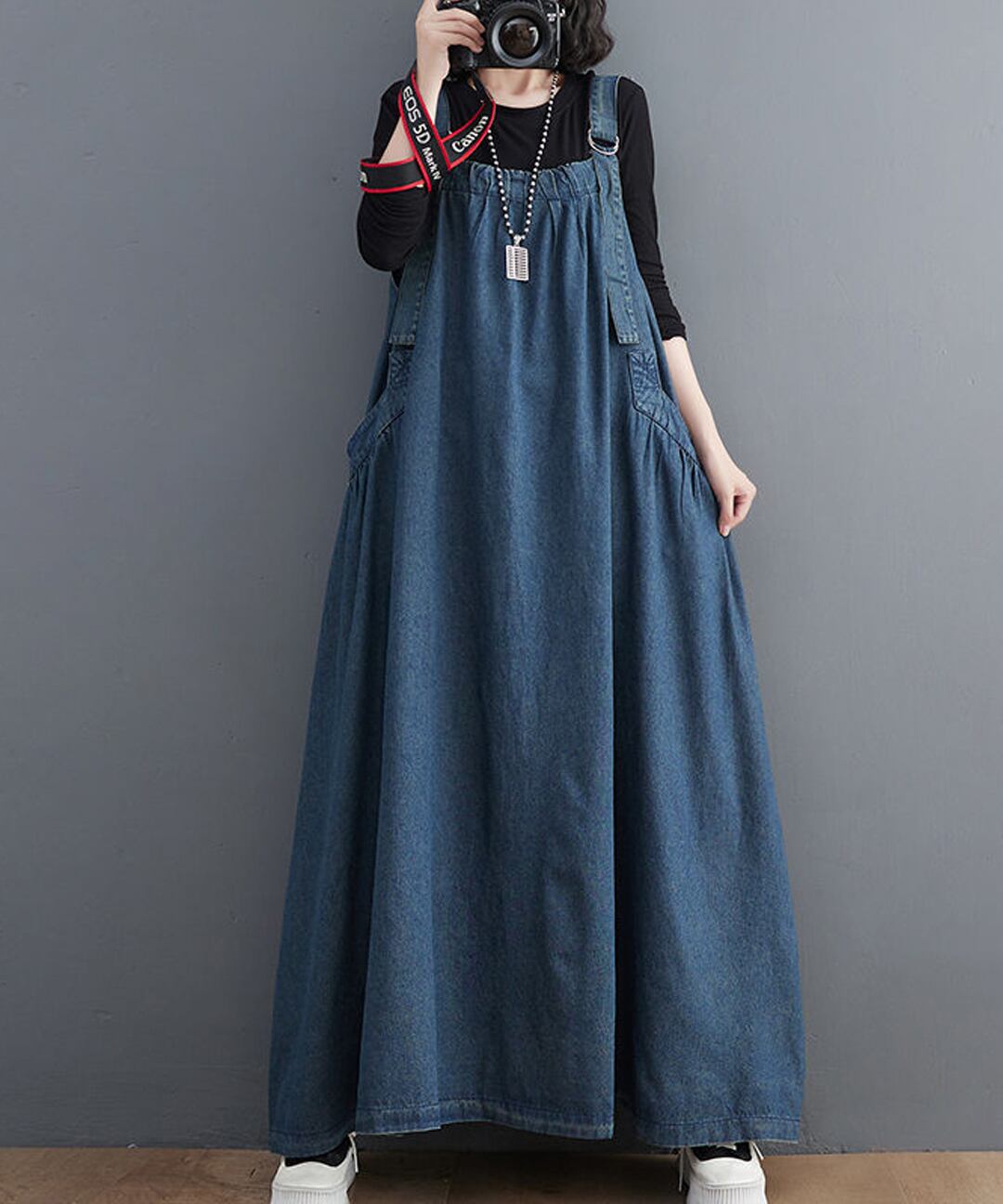 9.【ワンピース】大きいサイズ ロング丈 レトロ ゆったり 体型カバー デニムサロペットスカート