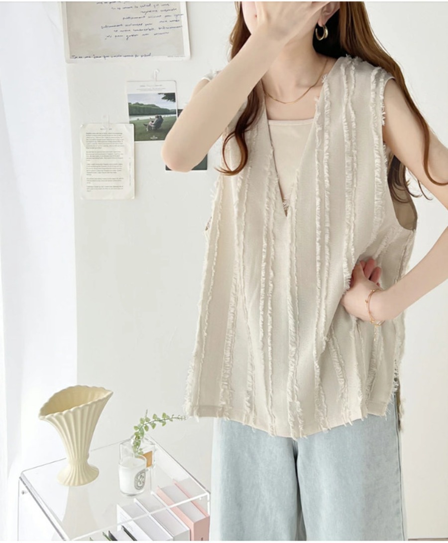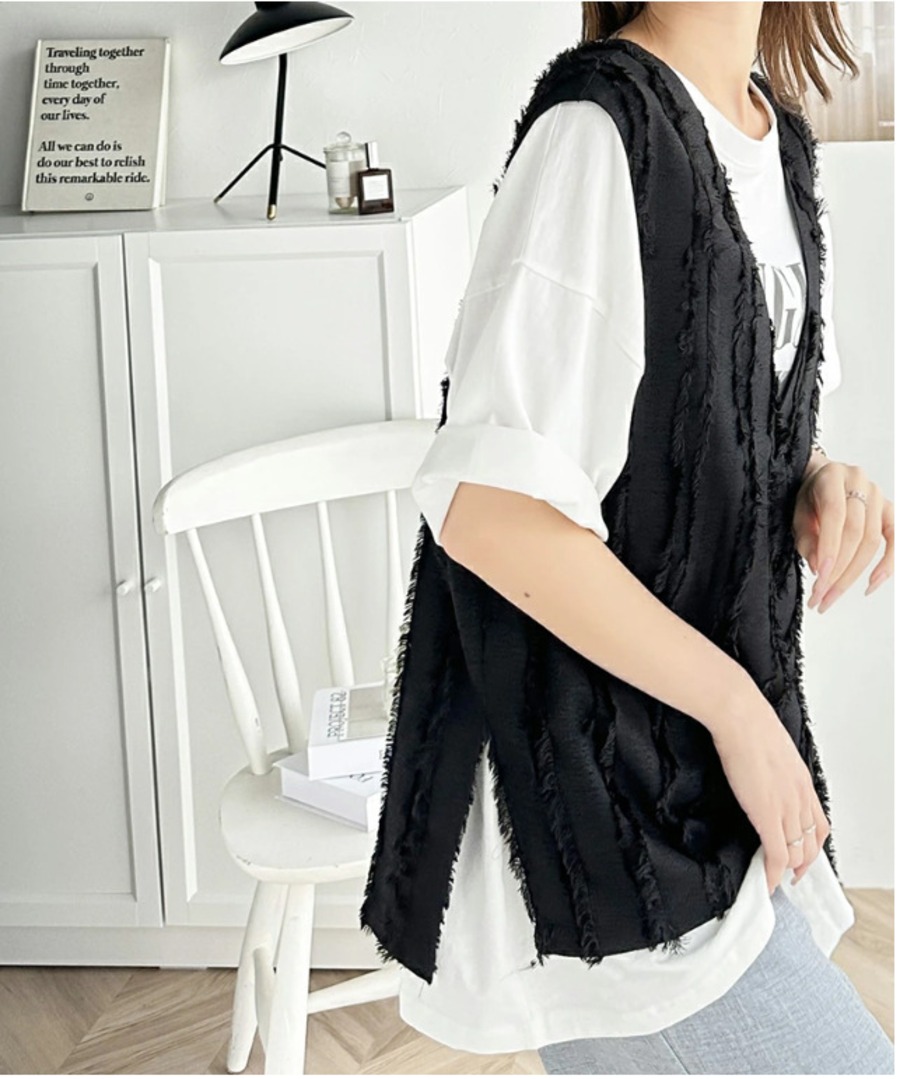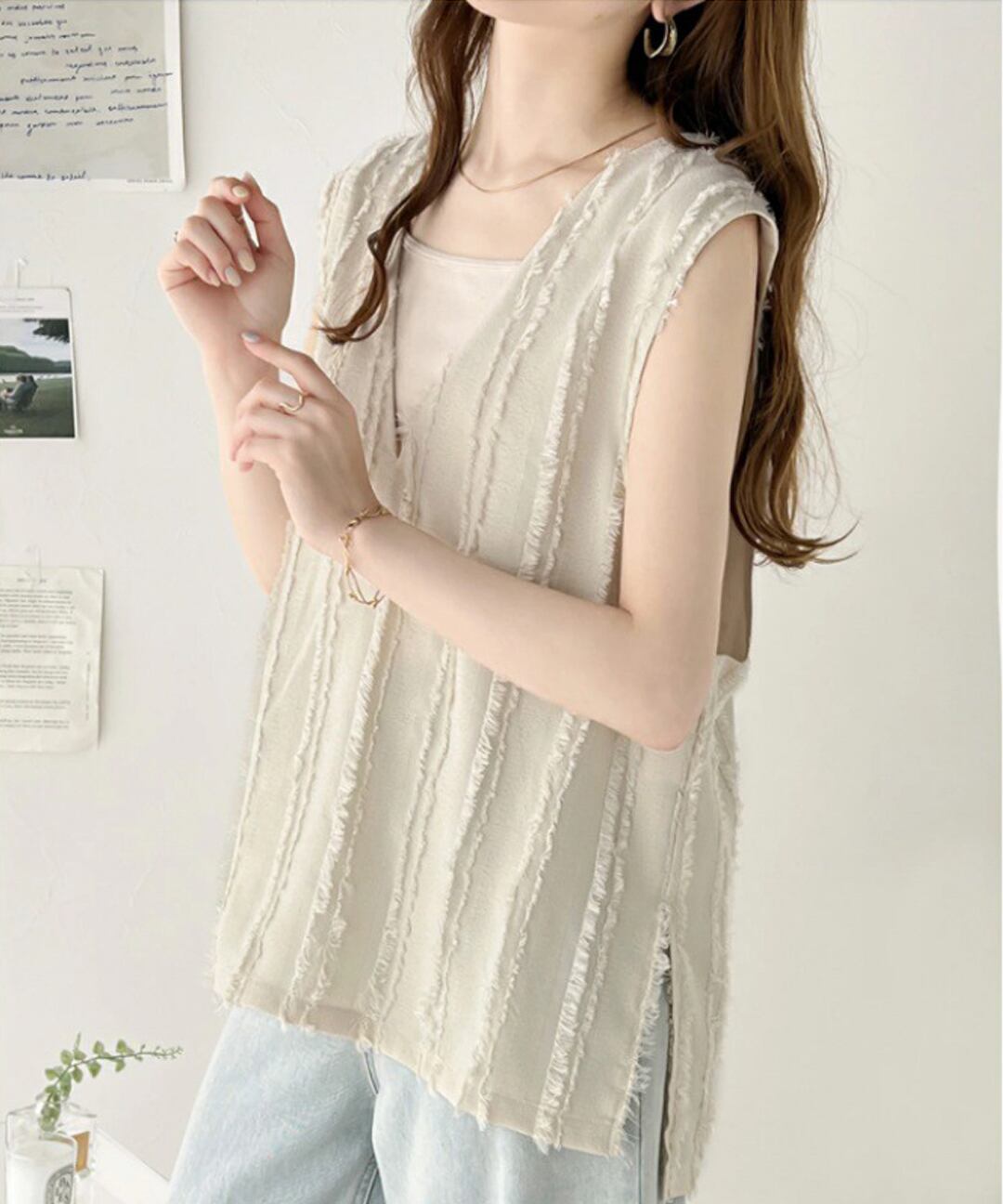 28.【トップス】Vネック フリンジ ベスト サイドスリット ゆったり プルオーバー トップス