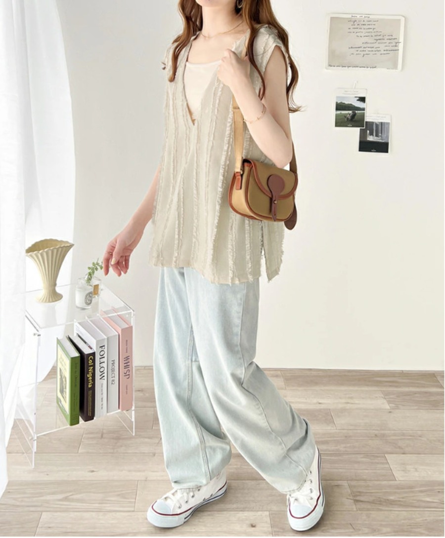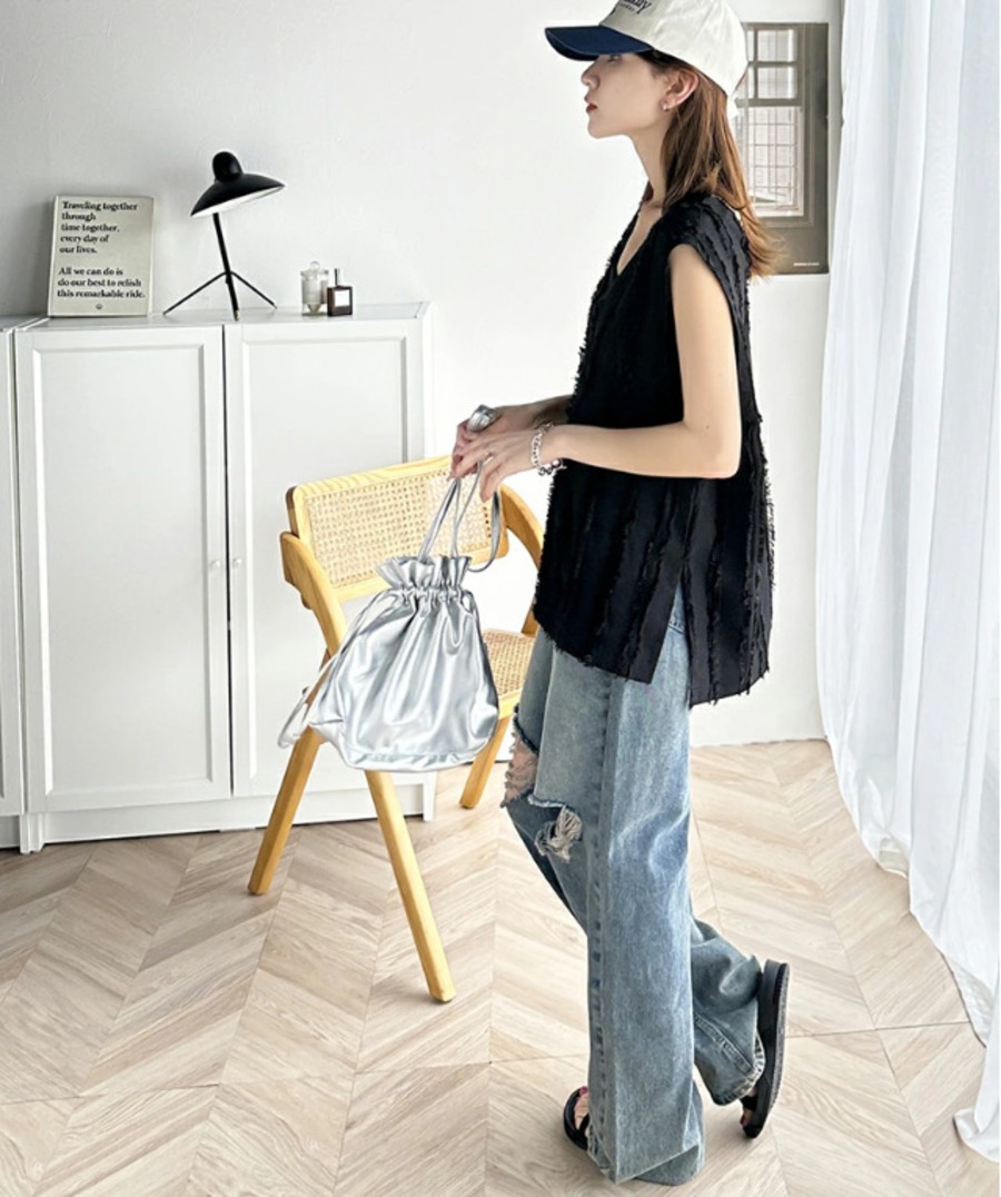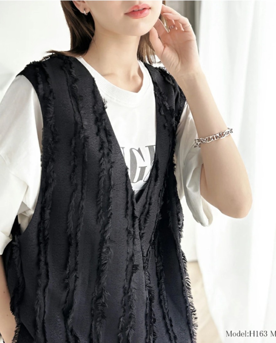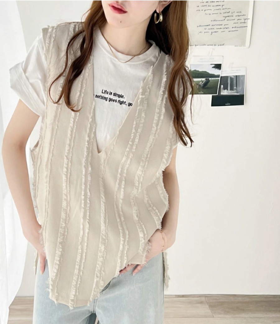 28.【トップス】Vネック フリンジ ベスト サイドスリット ゆったり プルオーバー トップス