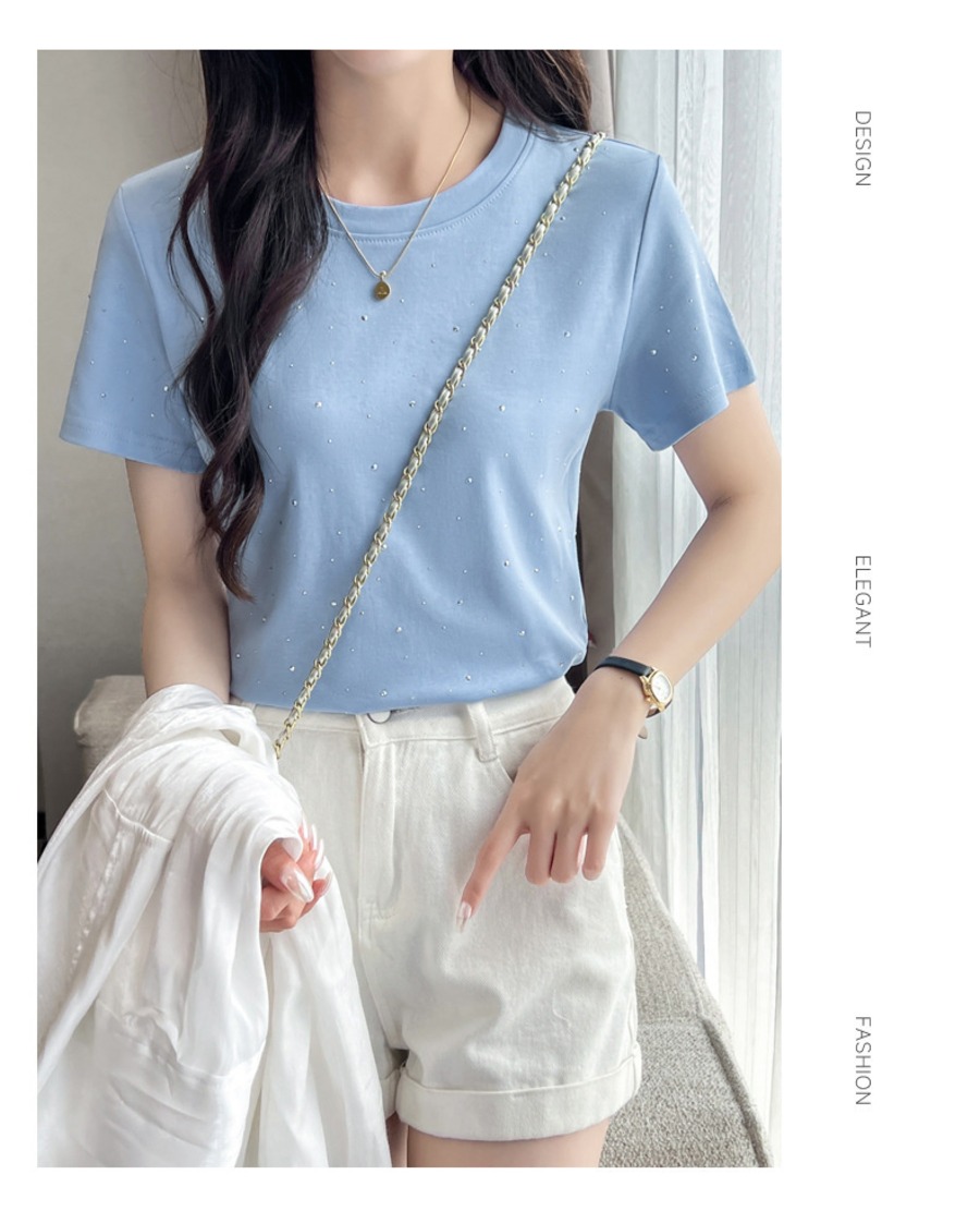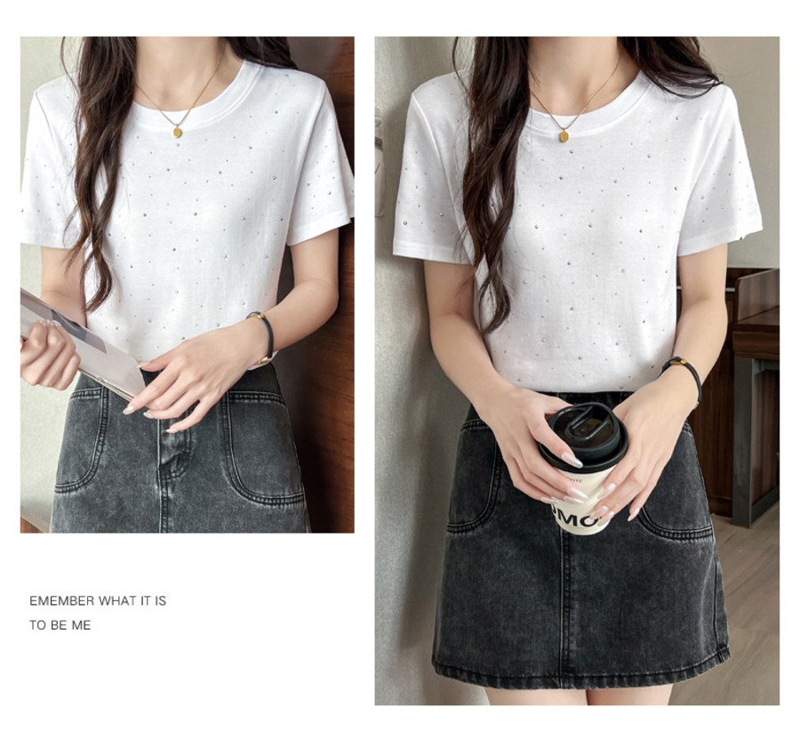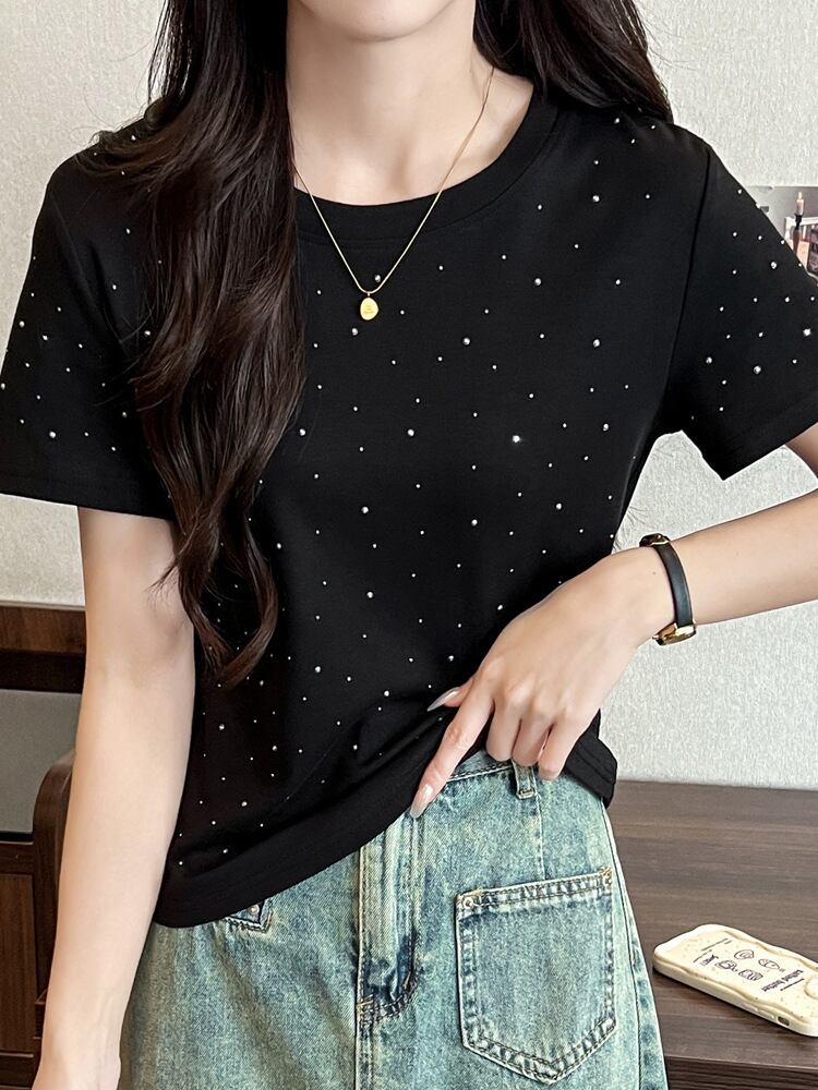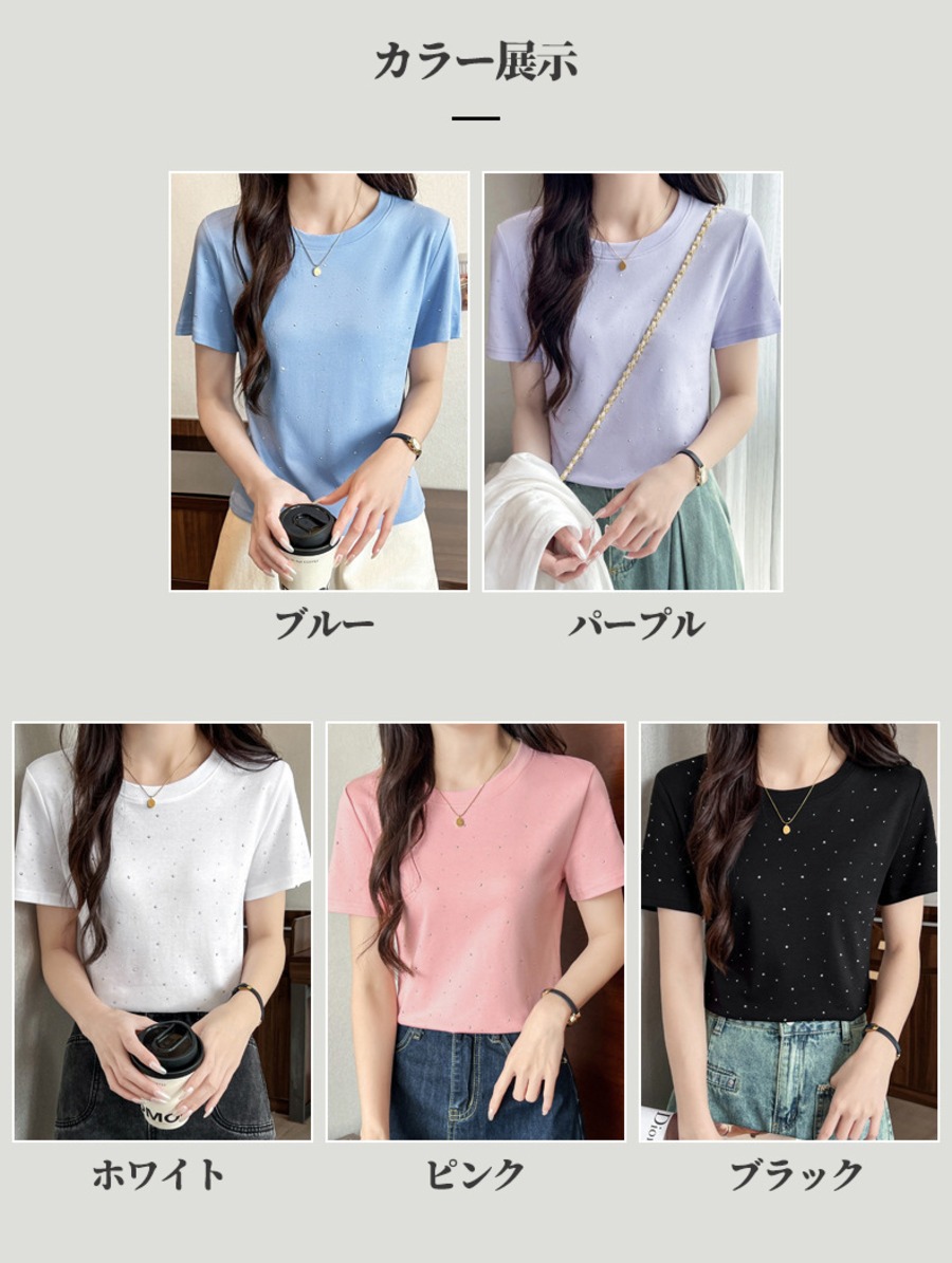 34.【トップス】ラインストーン 半袖 クルーネック Tシャツ 多色展開