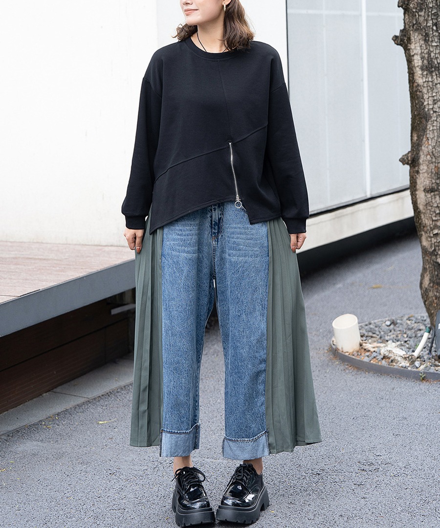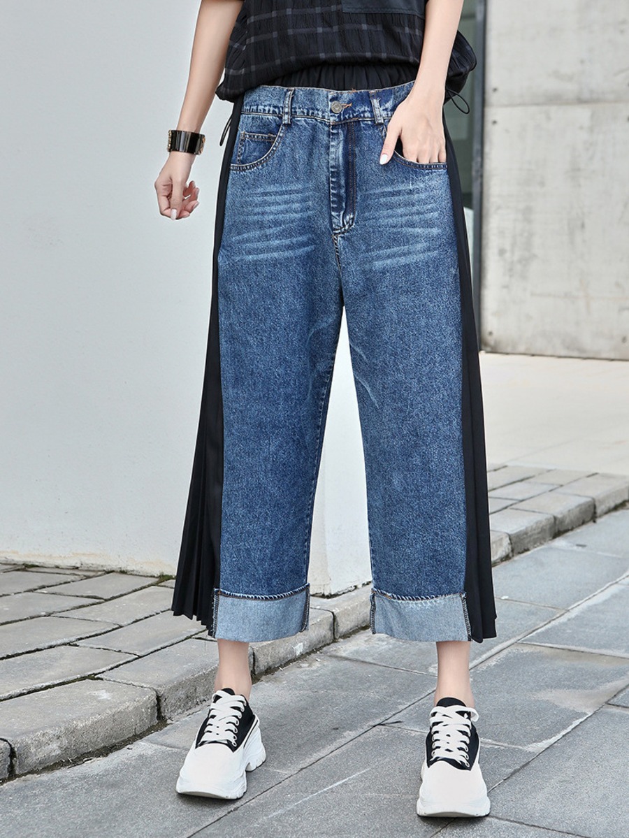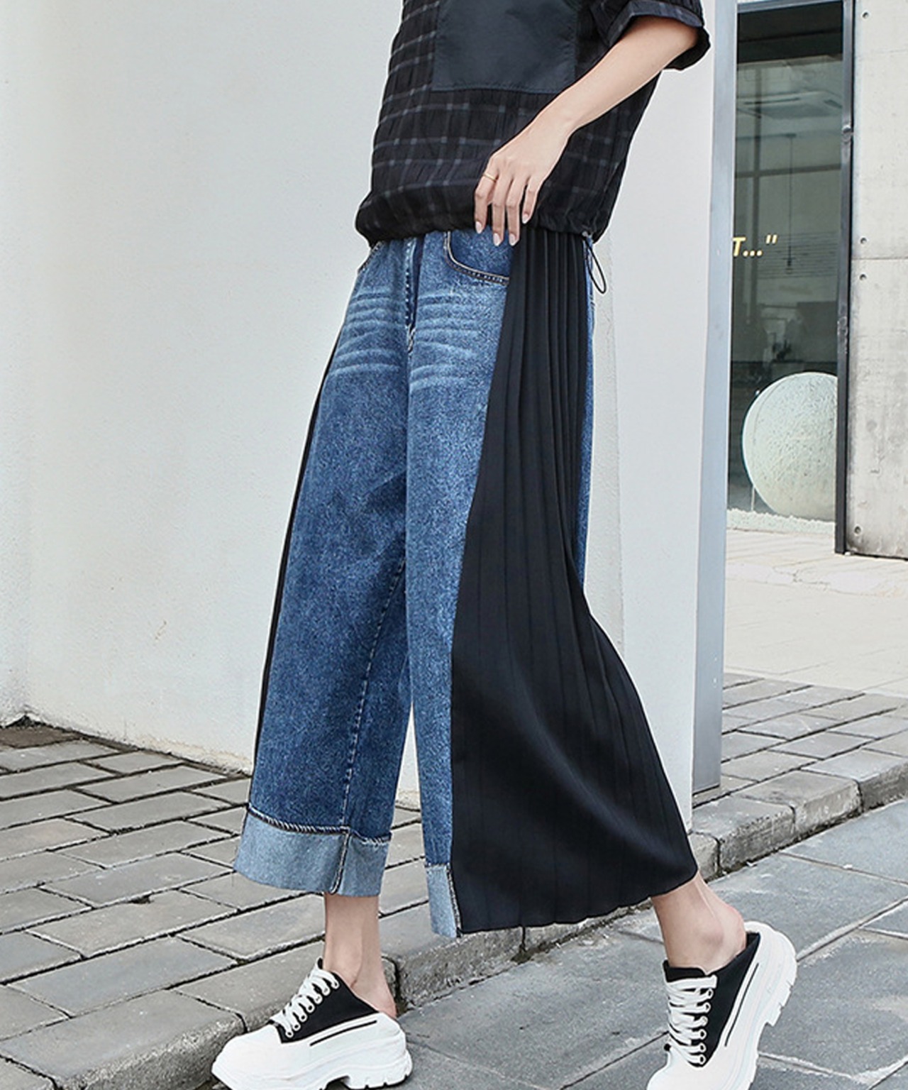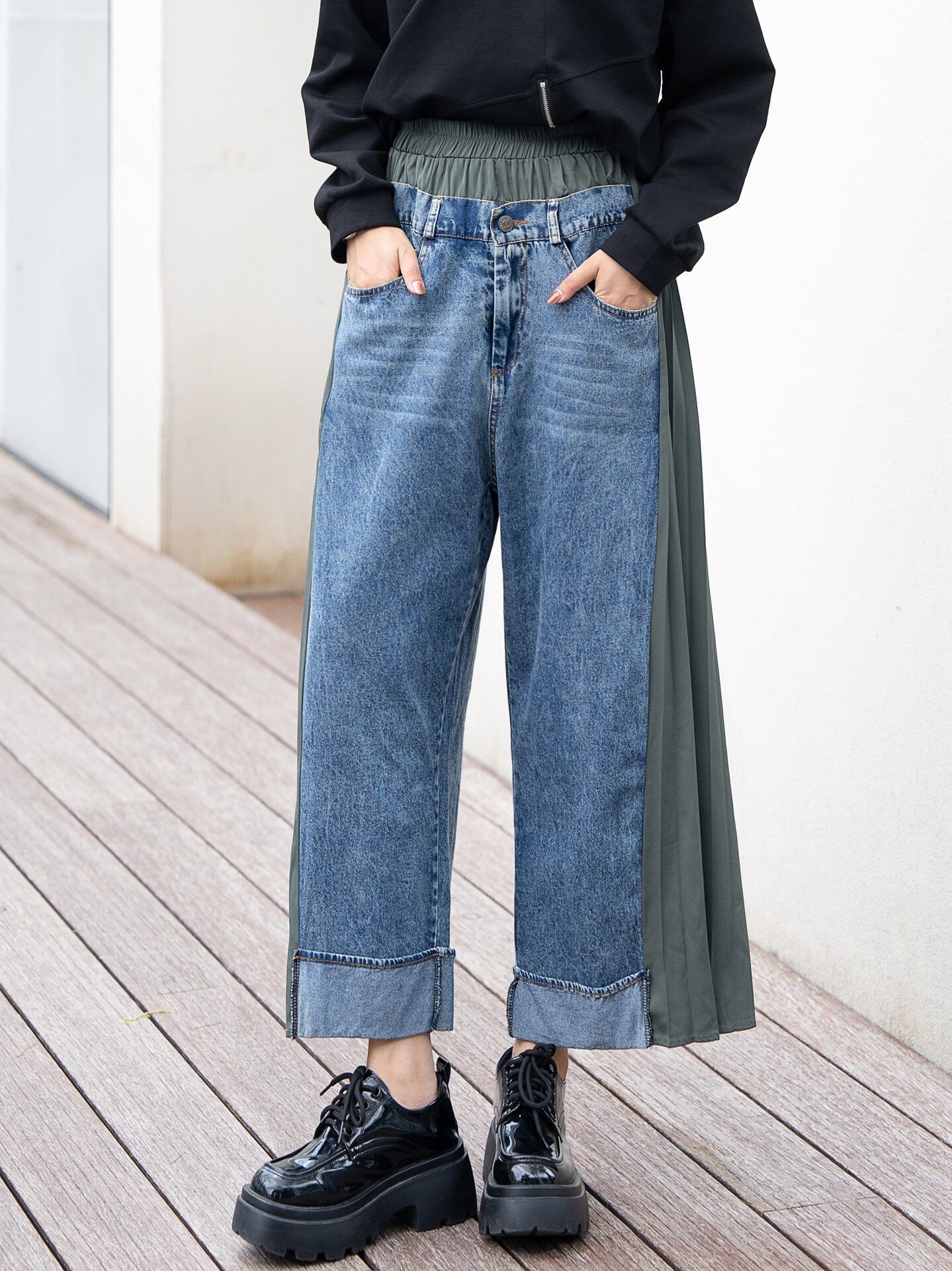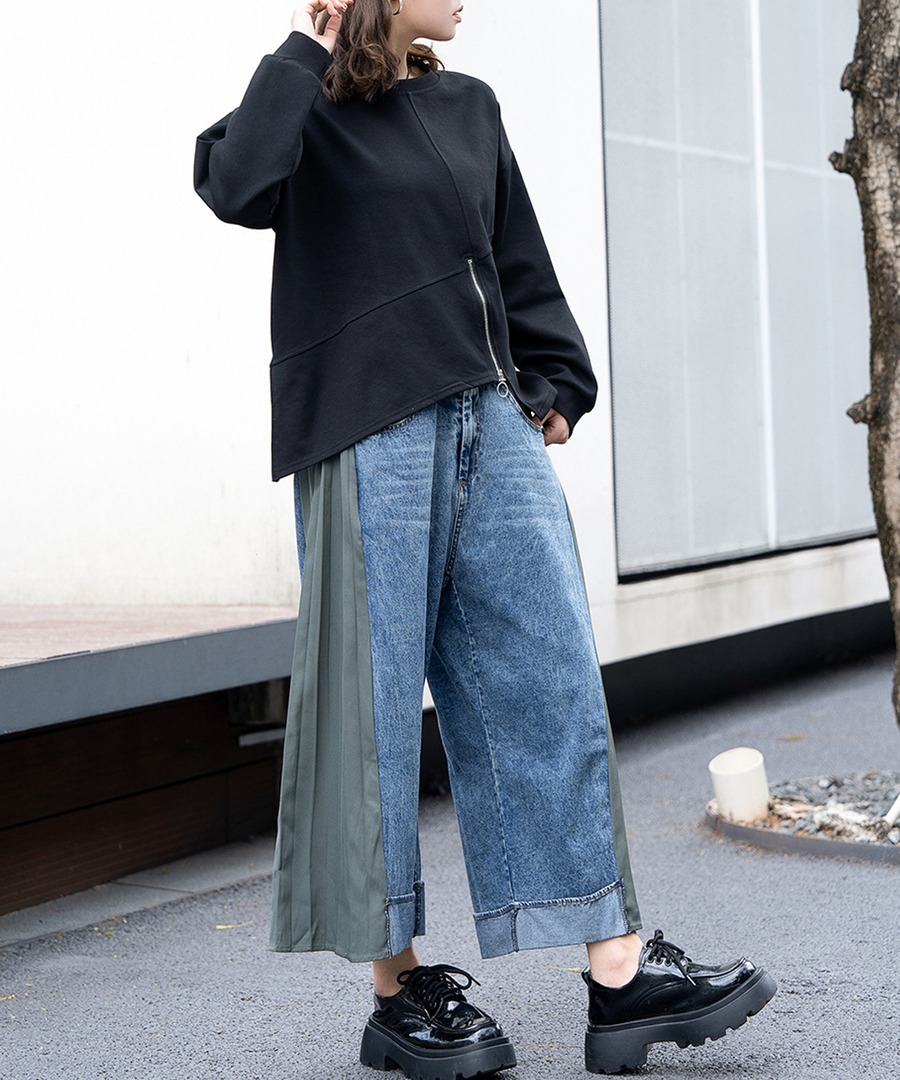 45.【ズボン】レトロ デニム切り替えプリーツシフォン ハイウエスト スリム見え ワイドレッグ 九分丈パンツ
